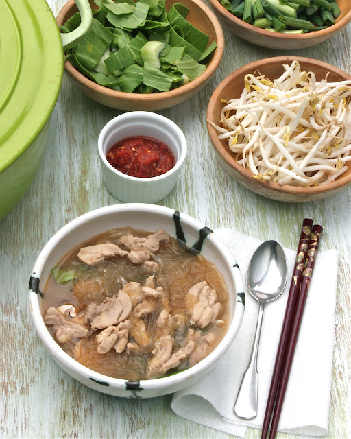 Bean thread noodles are made solely out of mung bean sprouts, therefore making this a gluten-free dish. It also fits easily into Tim Ferriss‘ “Slow Carb Diet” because the noodles add very few carbs per bowl.