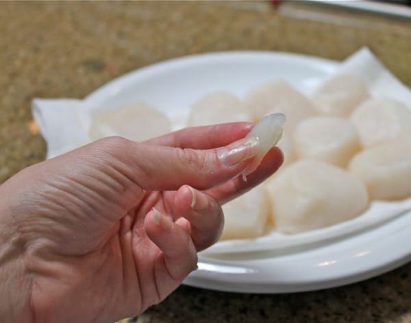 Removes the “foot” off the side of each scallop and dry them thoroughly–then salt and pepper.
