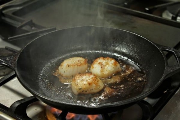 Heat an iron skillet to high. Dry the scallops thoroughly, then salt and pepper.