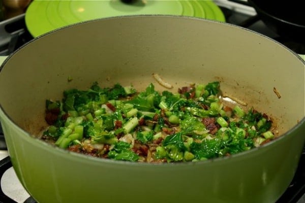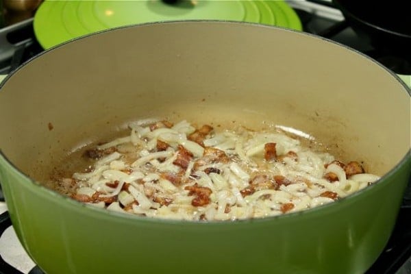 Heat a large, deep pan to medium-high. Add the bacon a cook 3-4 minutes.