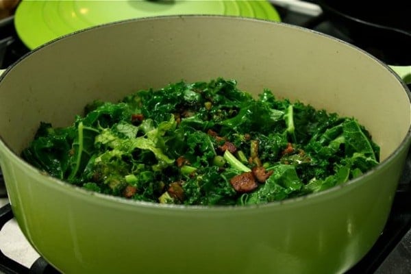 Slice the kale stems into thin pieces and the leaves into larger strips. Heat a large, deep pan to medium-high. Add the bacon a cook 3-4 minutes.