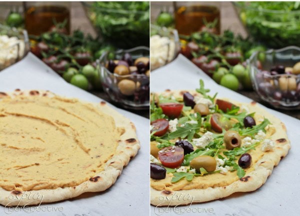 Grilled Pizza layered with hummus, fresh veggies, olives and feta.