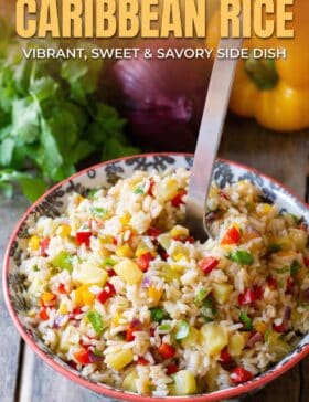 Our “Confetti” Caribbean Rice Recipe is a fragrant coconut rice recipe loaded with chiles, sweet peppers, pineapple, cilantro, and spices. Easy to make and so delicious.