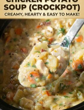 Healthy Crockpot Potato Soup with Chicken is a thick and creamy, comforting potato soup with chunks of chicken and tons of vegetables. By combining tender potatoes with vibrant vegetables and cozy herbs, you can make a slow cooker potato soup that the whole family will love!