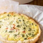 - Cook the quiche on high for 3-4 hours, or until the crust edges are browned and the center is set. Carefully lift the quiche out of the slow cooker using the parchment paper edges. Let it cool for 10 minutes, then cut and serve.