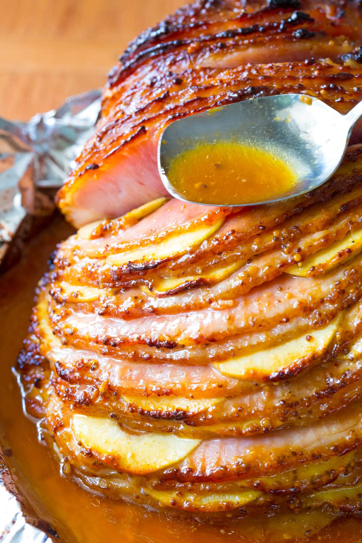 You don’t need to cover the ham before baking it. The apples keep it nice and moist on the inside, and the mustard glaze gets it crispy and perfectly caramelized on the outside.