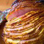 The perfect centerpiece for your holiday meal. A Baked Ham Recipe slathered with honey mustard ham glaze, stuffed with apples, and roasted to perfection!