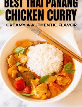 Find the full Chicken Panang Curry recipe with ingredient proportions, detailed instructions, and a video tutorial in the printable form at the bottom of the post.