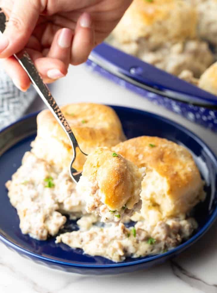This easy biscuits and gravy casserole recipe is a wonderful make-ahead breakfast to serve for family gatherings and holidays. It’s a combination of our glorious homemade sausage gravy that’s super simple to make, plus good quality frozen biscuits and just a few simple spices.