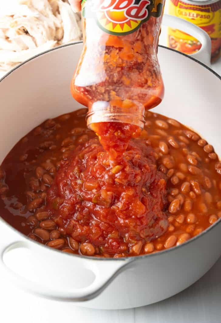 - Set a large sauce pot over medium heat. Add the beans in their sauce, chunky salsa, red enchilada sauce, and shredded chicken.