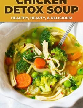 Chicken detox soup is a healthy soup made with lots of veggies and immune-boosting ingredients to detox your body from toxins. This recipe includes ultra-healthy flavor-makers like ginger, turmeric, and apple cider vinegar.
