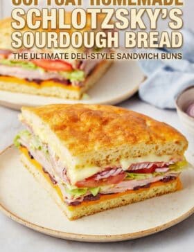 To make copycat Schlotzsky’s original sandwiches, layer on creamy garlic dressing (or Caesar dressing), cheddar cheese, Parmesan cheese, ham, salami, mustard, and sliced black olives. Toast in the oven until the cheese melts, then add lettuce, tomatoes, and onions.