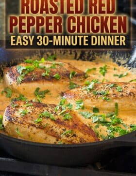 Find the full Roasted Red Pepper Chicken recipe with ingredient proportions, detailed instructions, video tutorial, and extra cooking tips in the printable form at the bottom of the post.
