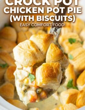 This Crock Pot Chicken Pot Pie with Biscuit Topping recipe is perfect for those who like a “set-and-forget” recipe. It tastes as if you labored for hours over the stove, but really only takes a few minutes to put together… And then the slow cooker does all of the hard work!