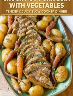 Crock Pot Pork Loin with Vegetables: An easy slow cooker pork loin recipe with potatoes, carrots, and onions in a rich tangy gravy.