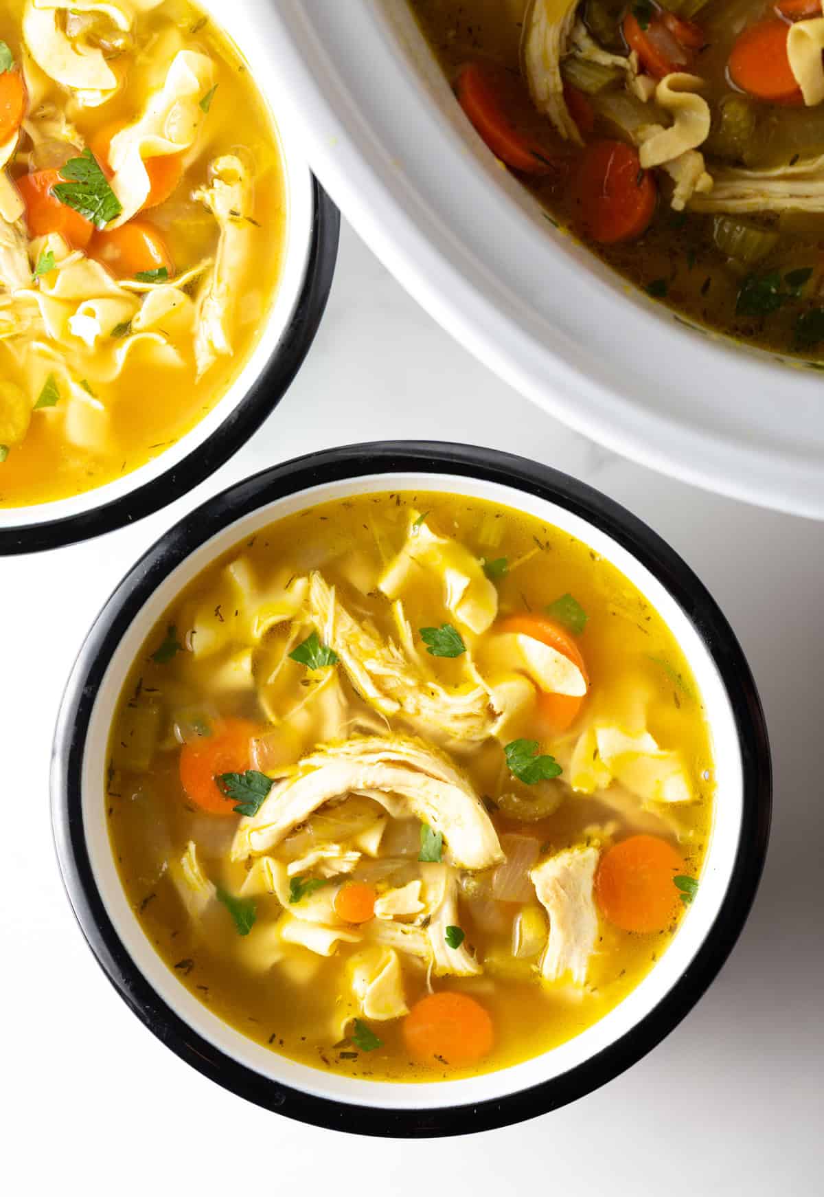 I’ve always considered chicken noodle soup a go-to recipe whenever I’m not feeling well, whether it’s a winter cold or you’re simply in a crummy mood. Because no matter the season, or how I’m feeling, chicken soup loaded with thick egg noodles in a warm, flavorful broth is sure to make me smile! I have a well-loved homemade chicken noodle soup recipe here on the site. It’s easy to make, and so satisfying. However, sometimes I want to throw everything in the crockpot and head out the door, only to come home later to a hot, steaming dinner. Today’s crockpot version is just the thing! It has the same incredible depth of flavor as our stovetop recipe, with a lot less fuss!