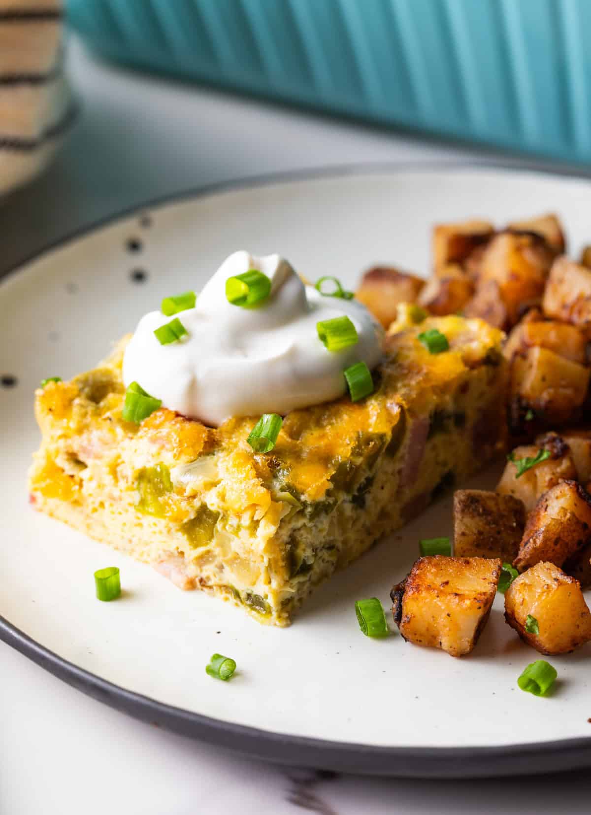 Protein Powerhouse – A trifecta of eggs, ham, and cheese makes this baked Denver casserole packed with protein. It has about 13 grams of protein per slice! And with no potatoes or bread, the recipe is relatively low carb when compared to many classic breakfast casseroles, like my ham and egg bake (which is delicious, no doubt!)