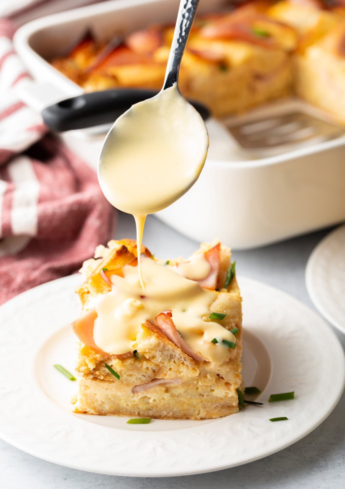- Chives – I like to sprinkle some chopped chives onto individual servings before drizzling on the hollandaise. The bit of fresh flavor helps break up the richness of the eggs Benedict breakfast casserole.