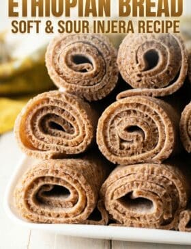 Ethiopian Breaad, known as Injera, is a staple Ethiopian dish that you definitely need to learn how to make at home! This sourdough flatbread is always paired with other dishes to soak up the saucy meats, veggies and beans that it accompanies.