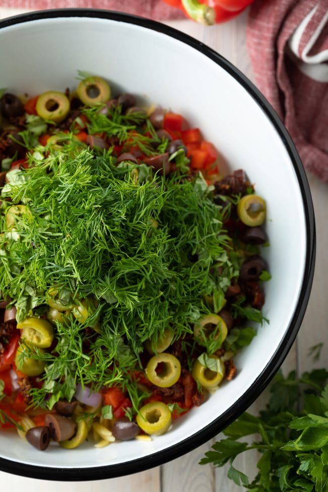 - Once the orzo is cooked and drained, place it in the salad bowl. Add in the bell peppers, olives, sun dried tomatoes, onion, and all chopped herbs.