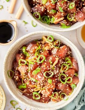Keeping things simple – I hate it when I’ve gone to the effort to get sashimi-grade tuna or salmon to follow a recipe, only to find that all the flavors of the fish get smothered in too many different ingredients. My ahi tuna poke recipe keeps things simple with a 3-ingredient dressing, plus some different onions for texture, and sesame seeds for a bit of crunch!