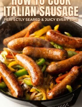 Italian Sausage and Peppers is a simple classic dish we make ALL the time. You can cook Italian sausages in 3 ways: in the oven, on the grill, or the stovetop. Whatever works best for you! While these are all great options, our favorite method to make traditional Italian sausages is in a cast-iron skillet.
