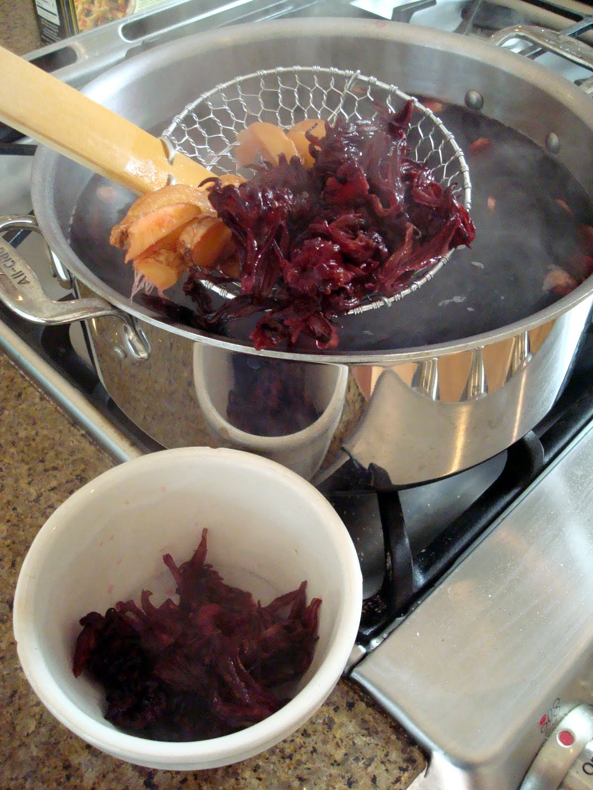 - Let the mixture cool and strain the ginger and hibiscus flowers from the tea.