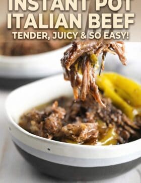 The tangy sauce with pepperoncinis perfectly balances the savory beef. You can enjoy this Instant Pot Italian beef on its own as a low carb option, or pile it high on sub rolls and cover it with provolone cheese!