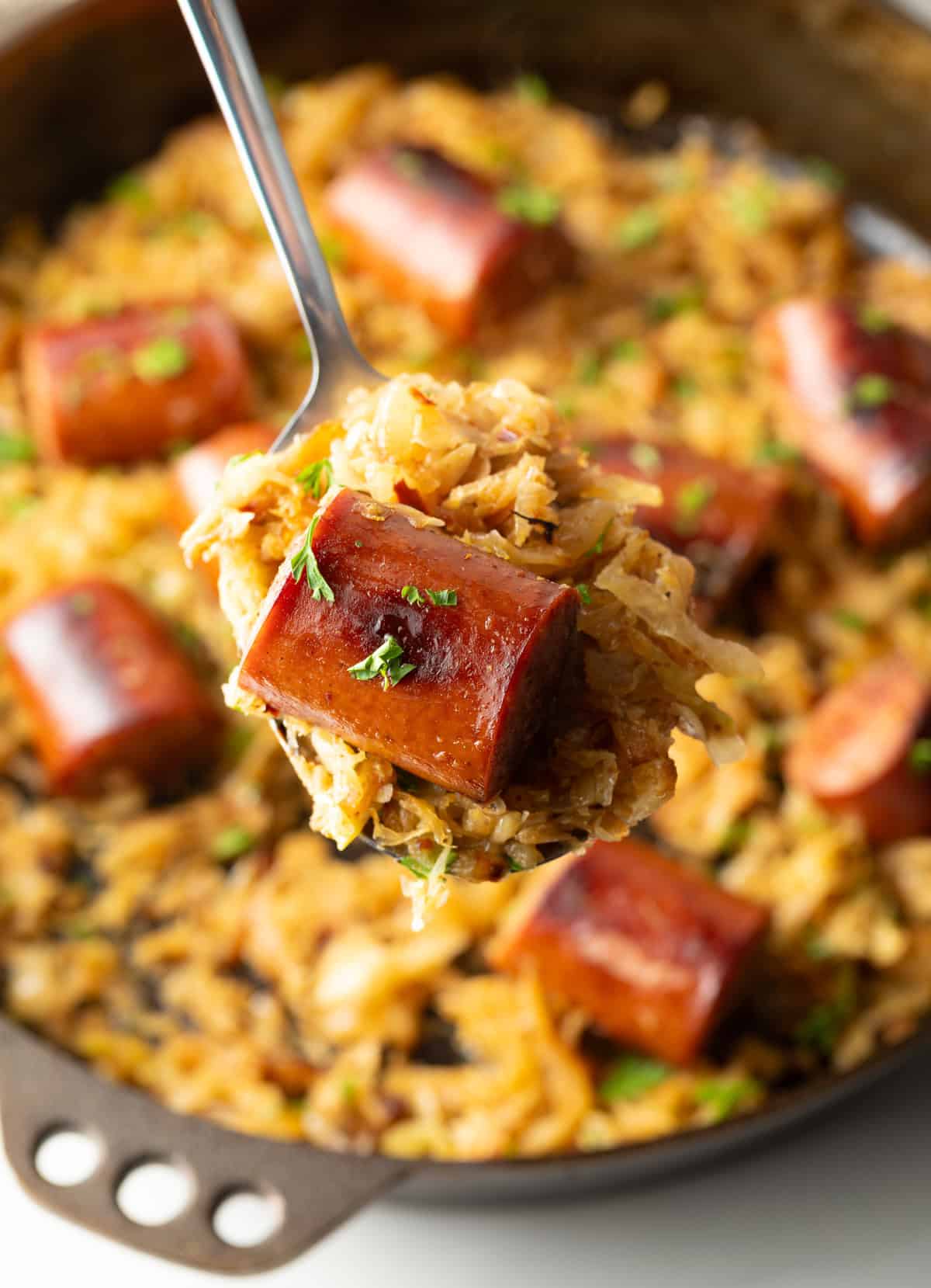 Fast and Easy Dinner – I created this sauerkraut and kielbasa recipe for maximum deliciousness output with very little effort. All you need is one skillet, a handful of simple ingredients, and only 20 minutes to prep and cook!