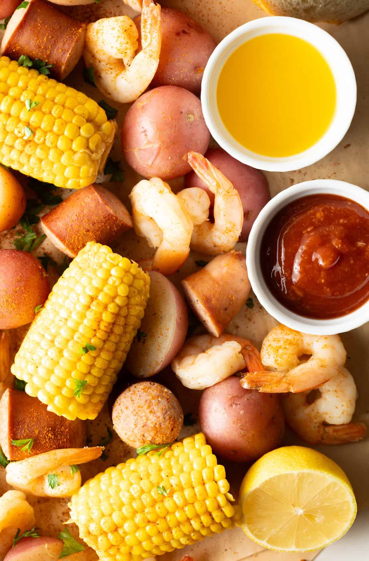 Southern Food at its Finest – This is what lowcountry cuisine is all about, people. My South Carolina-style shrimp boil with Old Bay seasoning and all the fixins’ tastes like a day on the water, minus the sunburn. The shrimp and sausage pieces are plump and juicy, the sweet corn and potatoes are perfectly tender, and you get lots of spice-ful (not spicy!) smoky, warm, and earthy flavors in every bite.
