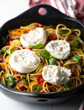 Pasta Burrata with Vegetables – An easy summer recipe made with roasted veggies like zucchini and tomatoes, all tossed with fresh basil and topped...