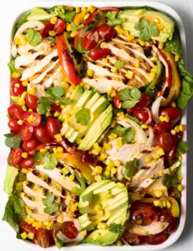 This fresh and delicious Grilled Chicken Fajita Salad is loaded with the bold flavors of chicken and veggie fajitas topped with a creamy honey-lime...