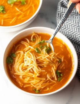 Mexican Noodle Soup Recipe—Sopa de Fideo is a hearty vegetarian tomato soup made with thin pasta, garlic, and jalapeno for a vibrant kick of...