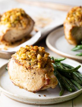 Apple Baked Stuffed Pork Chops Recipe – Savory, tender, and juicy pork chops are stuffed with sweet apples and cornbread stuffing, and baked to...