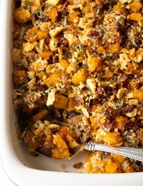 Butternut Squash Dressing Casserole Recipe – This roasted squash casserole features bacon, chopped nuts, and crushed crackers for a savory stuffing-like dish. It’s a...