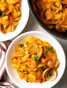 Seafood Pappardelle Recipe – An easy, quick, and delicious pasta with seafood sauce that’s perfect for summer! This Pappardelle pasta recipe includes wide egg...