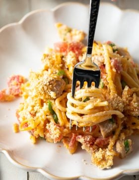 This classic recipe for baked Cheesy Rotel Chicken Spaghetti Casserole is loaded with spicy tomatoes and chiles, precooked chicken and spaghetti, and LOTS of...
