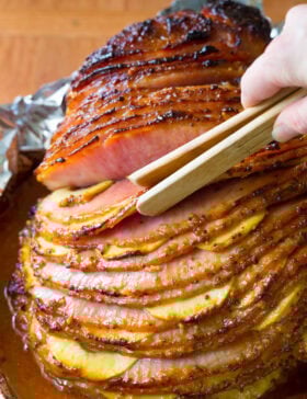 The perfect centerpiece for your holiday meal. A Baked Ham Recipe slathered with honey mustard ham glaze, stuffed with apples, and roasted to perfection!