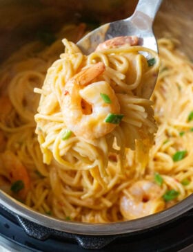 Bold and spicy Easy Instant Pot Bang Bang Shrimp Pasta, an easy pressure cooker dinner you can make in minutes!