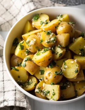 Steamed Potatoes with Garlic Herb Butter – We love this brilliantly easy side dish recipe! Simply steam baby potatoes then toss them with a...