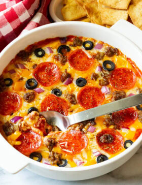 Easy Supreme Pizza Dip Recipe – This hot dip loaded with bubbly cheese, pizza sauce, and pepperoni (and any of your favorite pizza toppings!)...