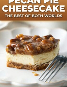 Plus, the individual bars are perfect for pre-slicing and serving at parties and large holiday dinners. However, I am also a big fan of a beautiful classic cheesecake. Making this Pecan Pie Cheesecake recipe in a springform pan does take longer to bake, but you wind up with thicker layers. It’s great for enjoying with family and friends for an impressive birthday or special occasion treat!