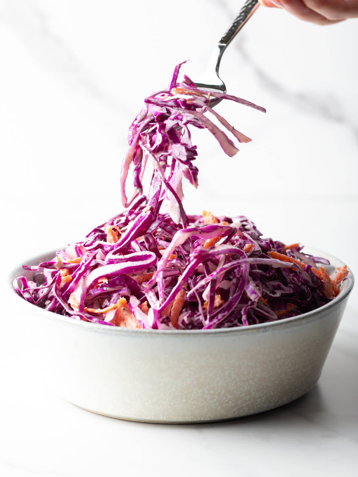 Keep the red cabbage coleslaw in an airtight container, and it will store well for 1-2 days in the refrigerator. But I usually like to eat it within the first day or so, while the shreds of red cabbage, onion, and carrot are nice and toothsome. Any longer and they’ll lose their snappiness.