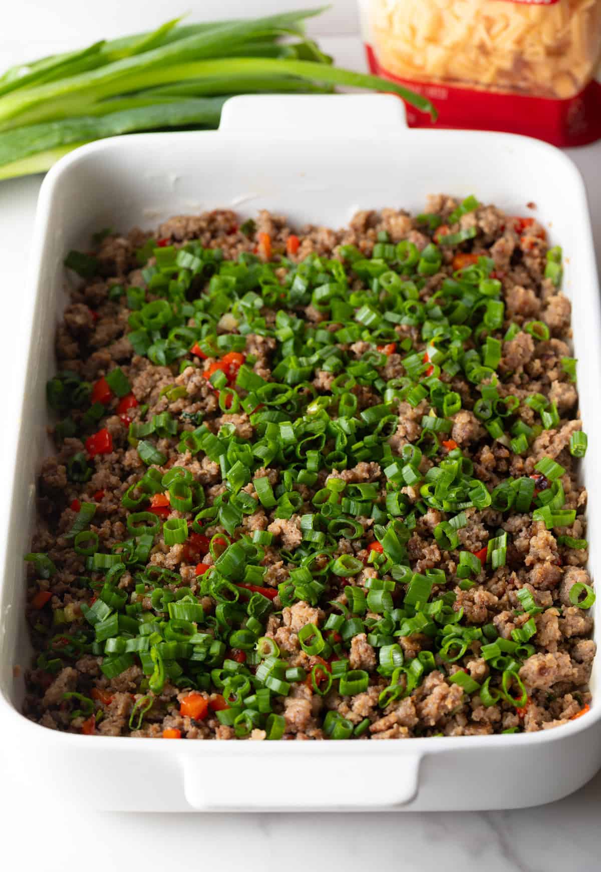 - Add the green onion tops and shredded cheese to the sausage mixture in the pan. Gently tossed to combine and spread out in an even layer. Pour the egg mixture evenly over the top of the sausage mixture.