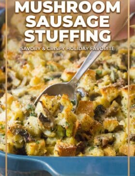 Mushroom Sausage Stuffing Recipe: This fluffy and comforting bread dressing is baked with zesty pork sausage and earthy mushrooms. It’s perfect for the holidays!