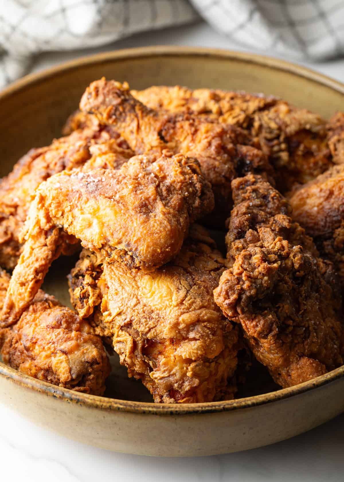 Honestly, I love to eat leftover fried chicken cold right from the fridge. It’s not as crunchy, of course, but well-cooked chicken will still be juicy and flavorful. But for those times when I am reheating, I’ll either bake it in a 350 degree oven for 10 minutes or so, or air fry pieces for 4-5 minutes at 350 as well, until the skin is hot and crunchy again.