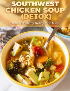 Generally, Southwest chicken soup is made with chicken, tomatoes, beans, corn, chiles, and bold spices like cumin. This soup is a little different since it is a detox soup recipe, so it doesn’t contain beans and corn, and instead has lots of nutritious veggies!